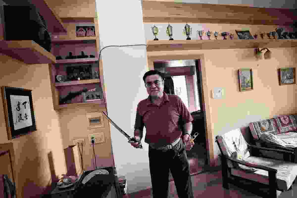 Aiyer lives in a third-floor Bangalore apartment with a fortified door that’s emblazoned with a rooster and the words “From Darkness to Life.” (The family crest, he later reveals.) Upon arriving, I remove my shoes and walk down a corridor lined with Stetson hats and photographs of lions looming over dead zebras. The living room has a wooden shelf stretching from one end to the other, lined with college trophies for debate, elocution, and quizzing, along with a Japanese sword, a savage-looking spear, and a crutch. Aiyer limps badly, the aftereffects of two disastrous automobile accidents, but his back is erect.