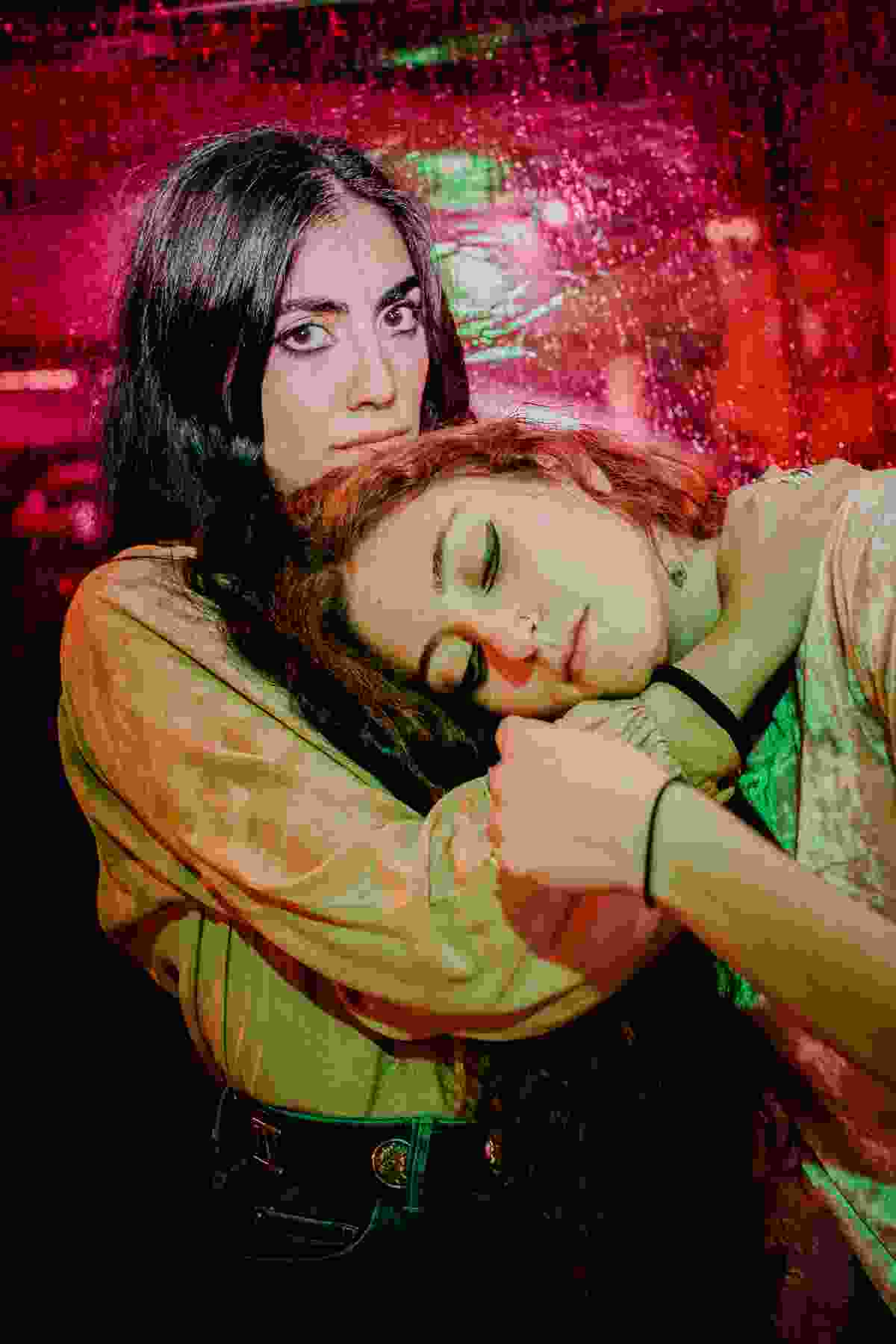 An inverse of this image appears early on in What’s Ours. It shows two women (maybe the women from the cover) set against rain-spattered glass — the rear windshield of a car, perhaps, or the front window of some café or bar — and bathed in red and green light. One woman’s head rests on the other’s chest, her arm held at an awkward angle, her closed fist hovering just above the other woman’s arm. Her eyes, lined in bold strips of black and silver, are half closed, her expression happy and drowsy, maybe after a long night of partying. With her wavy red hair and sleepy eyes, she resembles a figure from a Pre-Raphaelite painting, as does her companion, who stares directly at the camera, her face framed by her long black hair. She grips the red-haired woman’s shoulder in a gesture that looks comradely, steadying.
