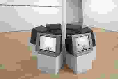 In the upstairs gallery, Fugitive extended the theme by inverting the immersive formal organization of Zoo and arranging a circle of TV sets around a column. An orangutan silhouetted against a dull gray sky swung from one screen to the next. As it reached the side of one monitor, the next monitor flashed on, pulling the viewer with the animal on its endless trajectory. The only sound track was a low static hum. Here enrichment and stimulation met their opposite: the dull monotony of captivity, tracked in the orangutan’s circular path.