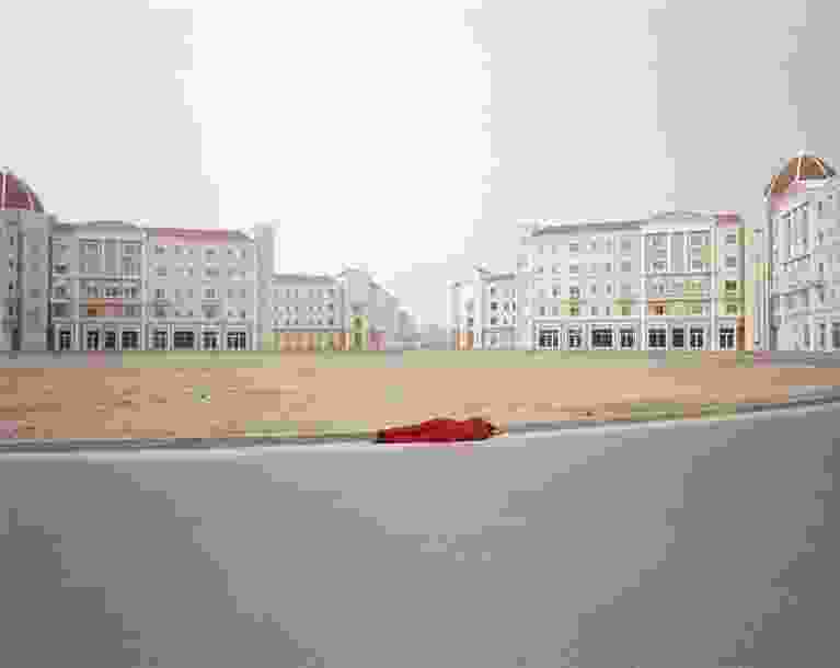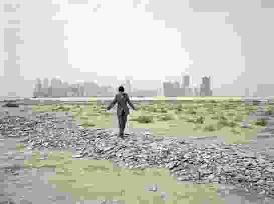 In her recent gallery exhibition at Paula Cooper, Young extended her line of inquiry into specific art-historical referents, bringing feminist and Marxist aesthetics into a speculative dialogue with corporatism. In a series of largescale photographs, Young, dressed in her signature gray power suit and sensible heels, re-created iconic performancebased artworks — by Bruce Nauman, Mierle Laderman Ukeles, Valie Export, Ulrich Rückriem, and others — amid construction sites in Dubai and Sharjah. The photographs framed the landscape in a way that emphasized the virtuality of a megalopolis springing up so quickly in the middle of the desert. They recalled both the wide-open landscape of the colonial imagination and the fantasies afforded by computer-based architectural rendering.