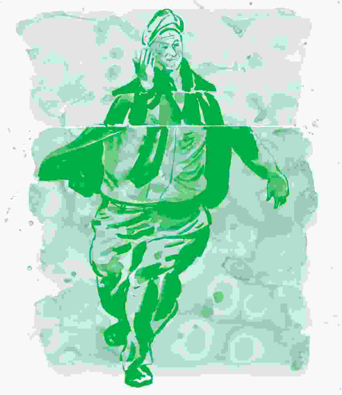 Nodjoumi conjures up whimsically absurd scenarios for these global power players. An astute student of body language, he subtly infantilizes the men, amplifying the ludic resonances of “power player” by presenting them as overgrown boys fighting and playing games. In Educating the Horse (2010) the titular equine hangs in a large net between two suited men. The man on the right has a deep blue head and shoulders and a brown body; he holds a stick in his left hand, ostensibly for disciplining the trapped animal. The man on the left is doubled over, knees bent, head turned upwards, as if this unconventional perspective might afford a unique insight into the animal being examined. But his cohort’s hunched shoulders, and the blank look directed at the cowering man on the left — a stance resembling that of a child who has just done something he knows is wrong but is unrepentant — suggest a more sinister reading: his colleague is keeled over in pain after being unexpectedly jabbed in the stomach. Similarly, The Personal Confession (2010) shows a larger-than-life man seated frontally and looking straight ahead while playing a game of cat’s cradle, strings going back and forth between his outstretched arms. Painted in a dark pink and partially hidden behind a translucent layer of grey paint, his tiny head sits atop a comically thickened, elongated, and segmented body.