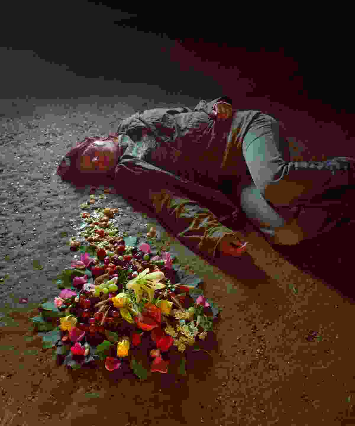 Fast nodded to this with two surreal moments: in the first, a naked man seated on a chair in an abandoned London underground station watched a projected film of a giraffe being shot in the bush; it leapt first gracefully, then ever more grotesquely, as blood spurted from its chest, the image filling the screen. In the second, a girl vomited, having been caught and savaged by police dogs as she attempted to make her way through the underground tunnel. As the camera panned over the mess, it turned into a still life of bright and shiny flowers and fruit.