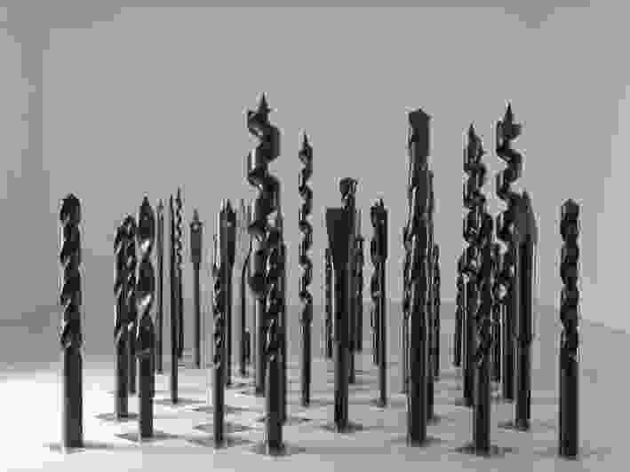 Pluie Noire — a sculptural forest composed of drills made from black marble — seemed an allusion at once to minimalist sculpture, to primitive totems, and to the draping of classical sculpture, with obvious phallic and industrial references thrown in. His Black House was a model for a utopian construction the artist will recreate in Jerusalem. This ecumenical mosque functioned as a monument-homage to the democratic project, mixing a myriad of architectural references (orthodox church, Wailing Wall, Forbidden City). Its black walls offered a blank page to the public, who were able to cover them with personal or political messages written in chalk.