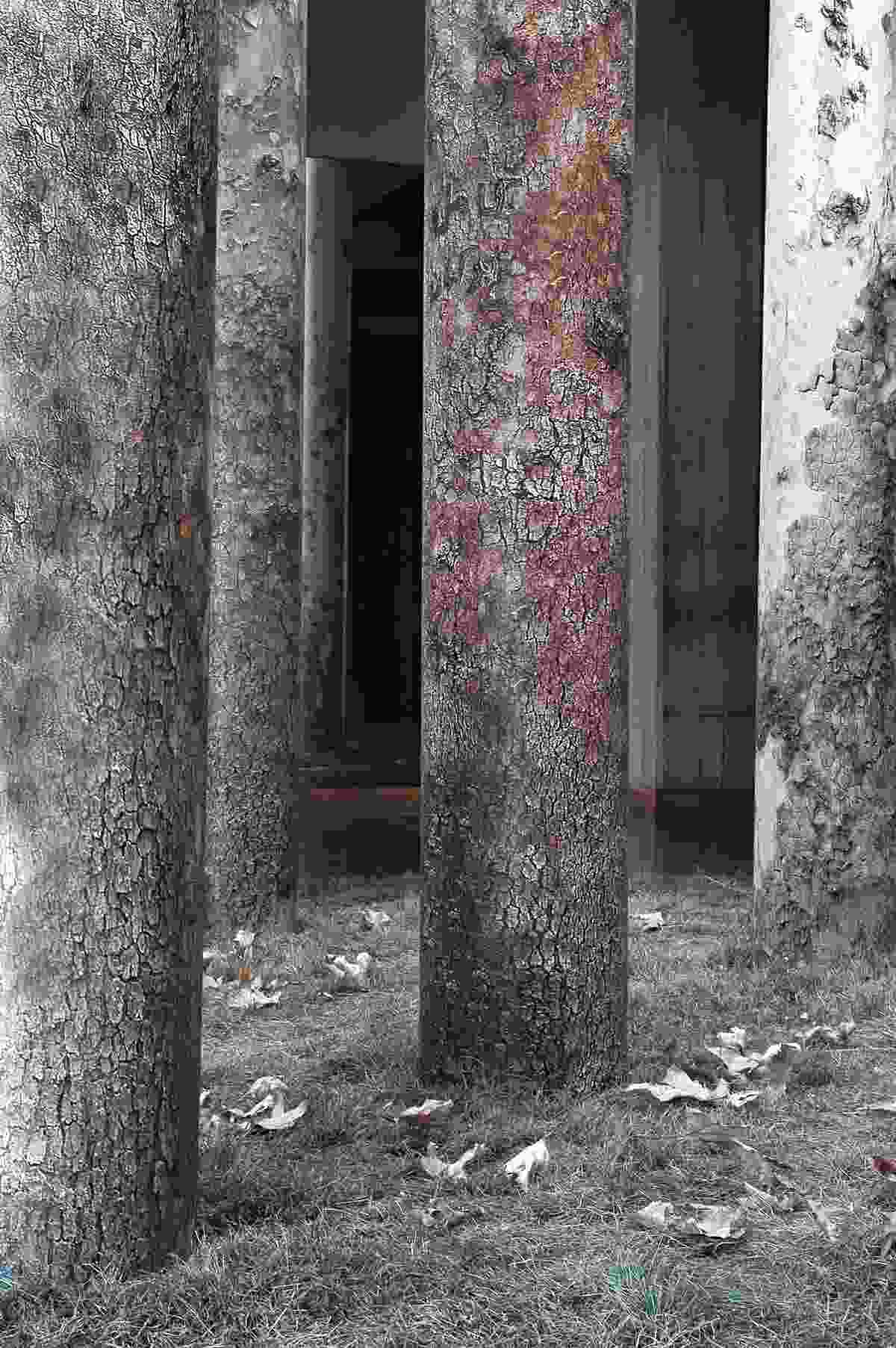 Mahdokht, a video by NY-based Shirin Neshat, is entirely consistent the artist’s tendency to engage in a symbolic signification of the social role of women. Mahdokht (based on a Shahrnoush Parsipour story) is arguably used in reference to a barren civilization seeking revival — here as manifest as a woman obsessed with fertility. Neshat’s protagonist is seen frantically weaving yellow threads. Finally, we see her dead in the watercourses of the garden, having taken her own life. Mahdokht, the mother of civilization and the soul of the garden, has been weaving with the “wrong” threads — stuck in an impossibly hopeless state. Now all that is left is a mass of seeds, presumably to disseminate throughout the world. Neshat, who also explored the timeless essence of the female in a previous work, Tooba, has once again dealt with the subject in this work. Filmmaker and sometime-photographer Abbas Kiarostami contributes an installation, The Leafless Garden, a series of bare trunks organized geometrically in an orthogonal array over a lawn-covered square at the center. Four mirrors positioned in the perimeter produce an endless image in four directions. The composition references the geometrical organization of the typical Persian garden while the parallel mirrors produce a visual effect that seems to allude to a vague notion of “eternity.” The title of Kiarostami’s work, combined with the visual austerity of the trees, seems to reveal the artist’s oppositional attitude toward the theme.