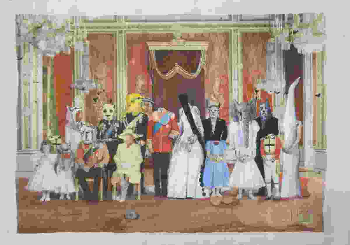 In one still from this work in progress, we see the familiar image of Mr. Middleton escorting his daughter in a grand procession. Her head is all but absent (so is his), and from her neck’s empty socket trails a set of little black balls that look like sex toys. The train of her bridal gown has morphed into an oversize human ear; and, from either side, what appears to be a river of blood emerges. In another still, a presiding priest’s entire face is absent, and has been replaced by a set of garish gaping jaws. Guards mounted atop horses are rendered as menacing centaurs. A state portrait of the royal family brings together a sad elephant, a horse, a toucan, a lion, and, of course, another headless apparition. That Mohammad-Reza Shajarian’s melancholy song “The Reign of Winter” — which narrates a man walking alone through the dead night of winter — is playing softly throughout, only adds to the creepy dissonance of what would otherwise be a carnival of good vibes.