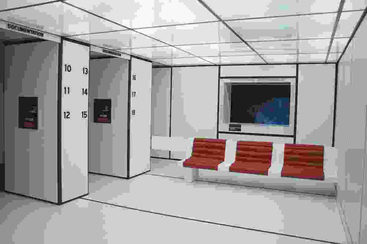 Mathieu Briand’s UBIQ, A Mental Odyssey remakes the entrance to the exhibition as a spaceship entryway based on Stanley Kubrick’s 1968 sci-fi epic 2001: A Space Odyssey, outfitted with retro-modern seating, nonfunctional controls, and a computer-simulated Earth (complete with clouds corresponding to real-time meteorological conditions) visible through a “window.” Inside this elaborate set, visitors are invited to don helmets equipped with cameras and viewscreens. By pressing a button on a handheld device, the viewer is able to change the image on the viewscreen, randomly toggling back and forth between that generated by her own helmet-cam and those of other viewers. UBIQ is touted as a “new approach to deconstructing the concept of the subject” through the interchange of another subject’s perception, “and by extension their thoughts and emotions.” But rather than creating a stream of schizo-subjects à la Deleuze and Guattari, UBIQ never exceeds the status of a novelty, an overdetermined parlor game for the late twentieth century.