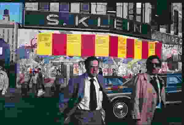 In 1983 they abandoned their storefront at 244 East 13th Street in order to function nomadically, turning their attention away from fixed exhibitions to utilize different distribution models and public spaces. This comprised renting billboards and ad space on subway cars, paying for inserts in the New York Times, and taking exhibitions to the street — “all refusals of established frameworks for the organization of art,” according to Ashford. This focus on dispersal and direct communication, rather than on autonomous art objects, meant that for a long time there was no official Group Material archive. Their output wasn’t maintained in any special or careful way; shows were documented but weren’t intended to last.