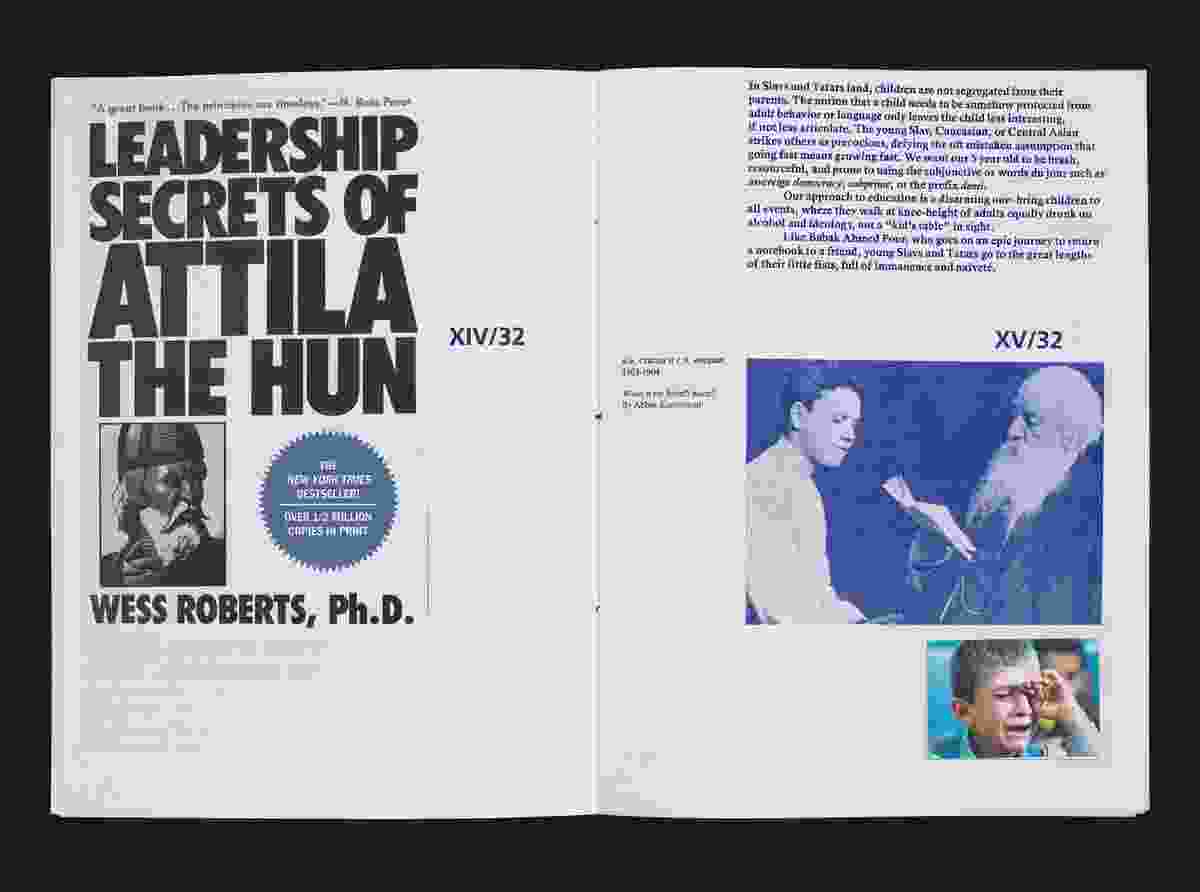 In A Thirteenth Month Against Time, a limited edition publication that was first shown at Newman Popiashvili Gallery in New York and recently acquired by the MoMA, S&T evoke an ancient Zoroastrian calendar, still used in Iran and Afghanistan, that boasts a thirteenth month. In over thirty-two pages, in bastardized calendar format, Slavs and Tatars tell us stories — all polemical, all curiously intriguing. This thirteenth month — part accident, part culled from history — is not only a lexical drift but also a call for leisure. An extra month is a space in which to think. And so, we have calendar days devoted to a mosque in Tatarstan; an ode to the rear guard (the left is too hip! Le Figaro over Liberation! the Economist over the Nation!); a celebration of Byzantium; and a tribute to the late, great Iranian thinker Jamal El Din Afghani — who alternately posed in Afghan, Arab, and Turkic drag (in musical terms, Slavs and Tatars tell us, he would be a David Bowie or Bob Dylan). They also urge us all to glean leadership secrets from Attila the Hun.
