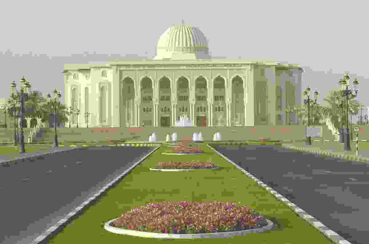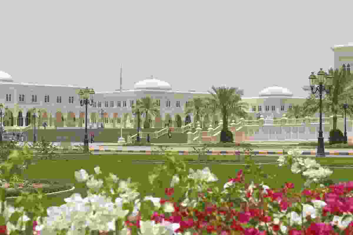 In the desert beyond Sharjah’s scrappy industrial sprawl lies the emirate’s eight-year-old University City. The American University sits at the top of a long, speed-bumped avenue of neat lawns, flanked by the lesser mortals of the higher education system — the police college, the women’s college, the arts college and so on. A kind of anytime, everywhere architecture, the imposing domed buildings sport myriad references cherry-picked from European, Middle Eastern and American classical traditions. In addition to the guards at the gate, who quiz me on my appointments and check my driver’s license, the only people who appear to occupy this Sim City are municipal gardeners, dressed in bright yellow jumpsuits, who are busy tweaking the sprinklers and manicuring the sections of grass.