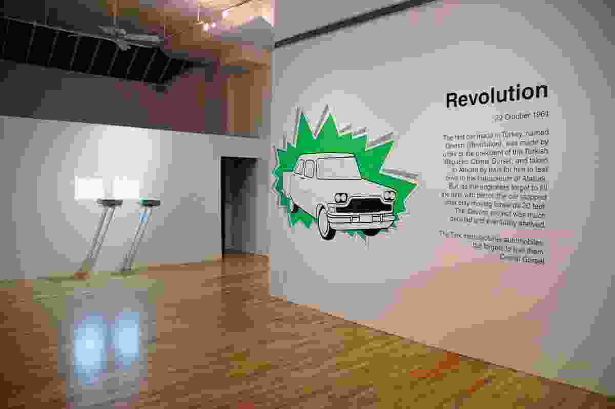 Devrim (Revolution) was a wall drawing of text and a cheerful, purposely naive, ad-like image of a car. We were informed that it was a Devrim car, produced in Turkey, and that to publicize it, the Turkish president was taken for a ride — but the car only made it twenty feet before stopping; the engineers had forgotten to put gas in it. It Doesn’t Matter depicted the artist’s struggle to connect with her grandmother, who’s grown apathetic and withdrawn. Seda asked her to recreate the catalogue of items sold in the tool shop where she worked in socialist Czechoslovakia. A video showed the grandmother discussing the tools as she drew them and was accompanied by a book detailing each drawing and a wall text in which the artist described her motives and feelings about the task she had given to her grandmother.
