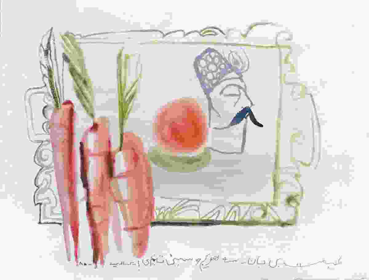 In his most recent exhibition at Tehran’s Golestan Gallery, Haerizadeh continued this vein of work and took on the still life. Peaches, carrots, eggplants, nectarines, Iran Air airplanes, images of former ruler Naser-el-din Shah and Iranian poet/prophet Sadegh Hedayat, and antique trays and plates all featured, in plain shades of purple, red, and yellow. These were paintings made in the fashion of quick script — spontaneously executed. In his still lifes, Haerizadeh played with the idea of the framed subject; the same lines that outlined peaches and nectarines developed and created a second frame for the subject. Or were the still lifes actually, simply, the subject themselves? One can never tell. Perhaps, Haerizadeh seemed to be offering, Magritte’s pipe was in fact a pipe after all.