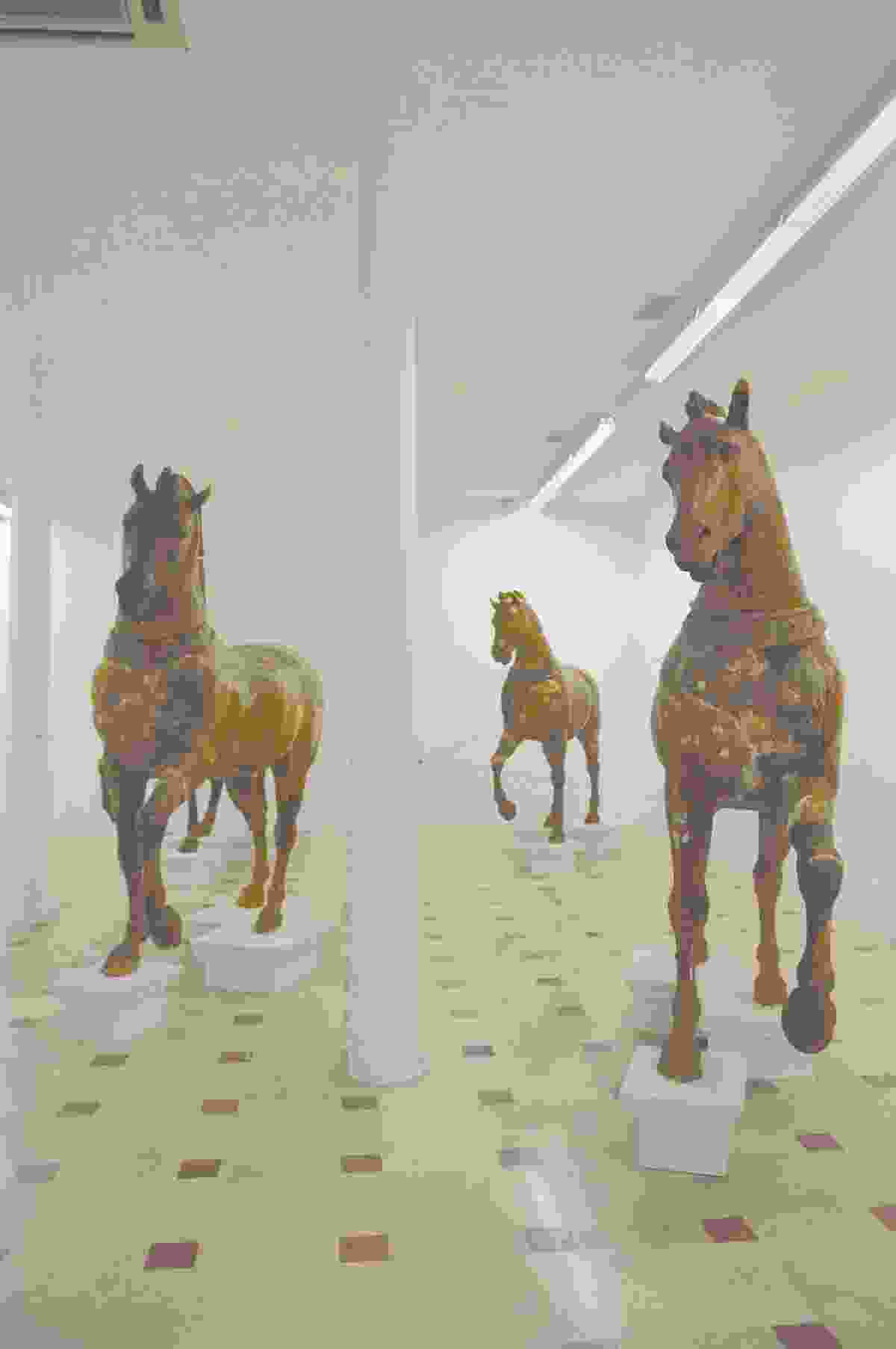 Most artists, still, retain some belief in figuration and images. Hüseyin Alptekin has imported four fragile plaster casts of monumental horse sculptures from Venice, copies of the ones atop San Marco cathedral. The catalogue entry to Alptekin’s work uncovers layer after layer of meanings centered on the sculptures. The original sculptures were taken to Venice by crusaders from the Sultanahmed hippodrome in Constantinople in 1204. When and how they came to Constantinople is unclear, although perhaps they were moved from Nero’s Roman villa.