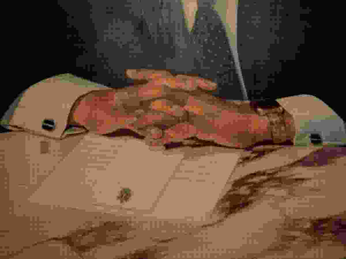 There are gifts from average citizens, too. Citizen Sonia Habashy offers a large painting of a grumpy old man; another likeness, crafted by an unnamed citizen, weaves a portrait of the president as an emaciated young man with a narrow face, posed on a small, cheap, touristic carpet. A young artist named Mohamed Abd El Rehim gambles on the future continuity of the presidential line with an alabaster Mount Rushmore–like sculpture, featuring the visage of the president carved out of a mountain, surrounded by the faces of his grandsons. The official attributes of the leader, as promulgated by the state propaganda machine, are all present in Amr Fahmy’s cartoon drawing of the president, inscrutable in his shades, the complete lexicon of Egyptian symbology held tight in his embrace (the pyramids, the Nile, minarets, church towers, soaring military jets, and factories). At the end of this display, visitors confront a large-scale blowup of the president’s national identification card, suggesting that he is an average citizen who just happens to rule the country.