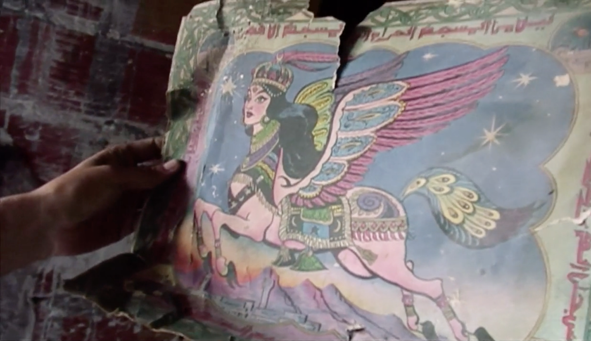 In 1979, after a succession of further tyrants at the CCM, a new, sympathetic director was appointed, Bouanani received a raise, and he was finally able to make what would become his only feature film — the cult classic al-Sarab, or The Mirage. In the opening scene, two men haul sacks of flour along a hillside path, and argue over whether a cherished donkey may be buried in a cemetery. Will donkeys be admitted into paradise? Their conversation evokes the Prophet’s night journey to heaven aboard the winged steed Buraq, the ascent known as the miraj — a word so close in sound to mirage — from the Arabic root “to rise.” One of the men, Mohamed, discovers bankrolls of dollars hidden in the flour. He sets out for the city with his wife Hachemia to exchange them for dirhams, in a quest reminiscent of Arabian Nights tales of men seeking their fortunes abroad. On the bus to Salé, they encounter a ragged, raving messiah who captivates Hachemia. “At the resurrection, everyone will have the same face,” he preaches to his followers. Meanwhile, Mohamed is too afraid to enter any bank, fearing its European clerks will assume he stole the money. When he meets Ali Ben Ali, a mysterious magician who claims he can help him, the naive Mohamed is drawn into a shadowy underworld of dissent, although its nature is never made explicit. Inside Ali’s hideout is a gigantic canvas of Buraq — painted by Naïma.