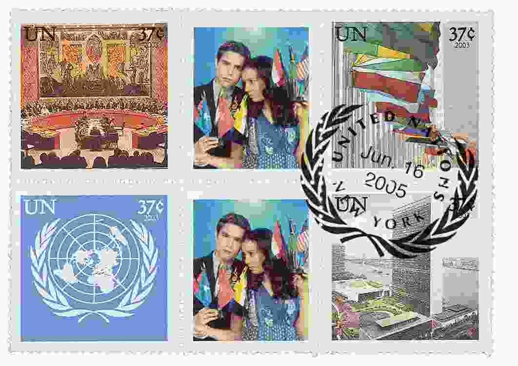 Hoping for some memento of our less than momentous morning, we paid fourteen bucks to get our pictures printed on an official UN stamp back in the lobby. Although the camera was digital, the technician refused our ardent requests for retakes. Categorically. On the resultant stamp, one of us came out looking decidedly feline, the other quite like what we imagine Mr. Spock’s daughter would look life if he had (blonde) offspring. And only later did we find out that the stamp is only valid if mailed from UN premises. Now they tell us. Nontheless, we know the UN has known finer