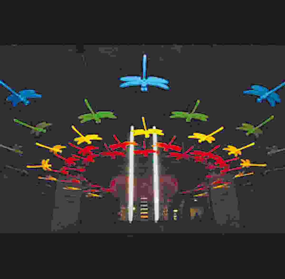 The first installation addresses the events of September 11, 2001. Fotouhi’s Toward Salvation, which intentionally opened on the four-year anniversary of the attack, is a poetic and soothing piece despite its obviously brutal subject matter. Two white neon tubes, symbolizing New York’s razed monuments to commerce, hang suspended and perpendicular to the floor in a darkened room. Surrounding their radiating beams are concentric circles of multicolored insects that fly directly toward the lights, transfixed and lured by their luminescent gleam. Just as the moth cannot deter its route despite its own imminent self-destruction, so these dragonflies — whose tubular form and extended wings recall an airplane — can do nothing but fly to their death.