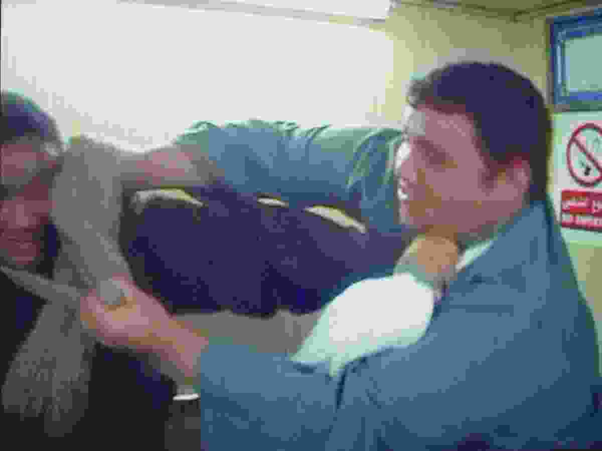 Take The Green Land Circus’ trio of projections. The main screen, located at the end of the walkway, shows a staged altercation erupting between fifteen people. A second projection to the right of the walkway reveals the casting process for the main video. The third screen to the left features old screen tests of Shawky’s actors. (The most memorable is a 1970s comedy sketch showing conversation between a Middle Eastern Burt Reynolds and a peroxide-headed midget.)