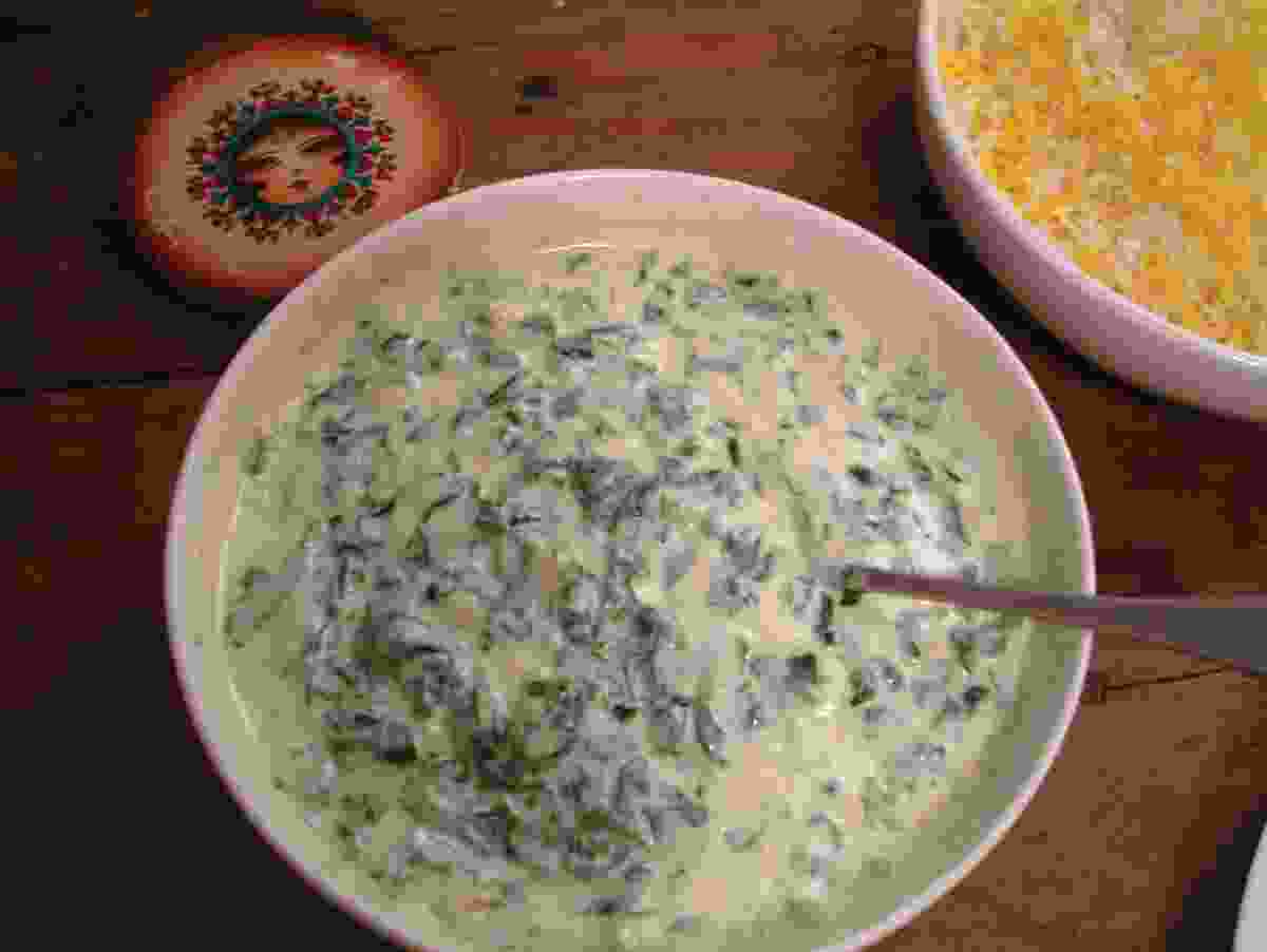 Ingredients2 onions, chopped4 garlic cloves, minced10 oz spinach, roughly chopped16 oz yogurt3tbs extra virgin olive oilSalt and pepper to taste