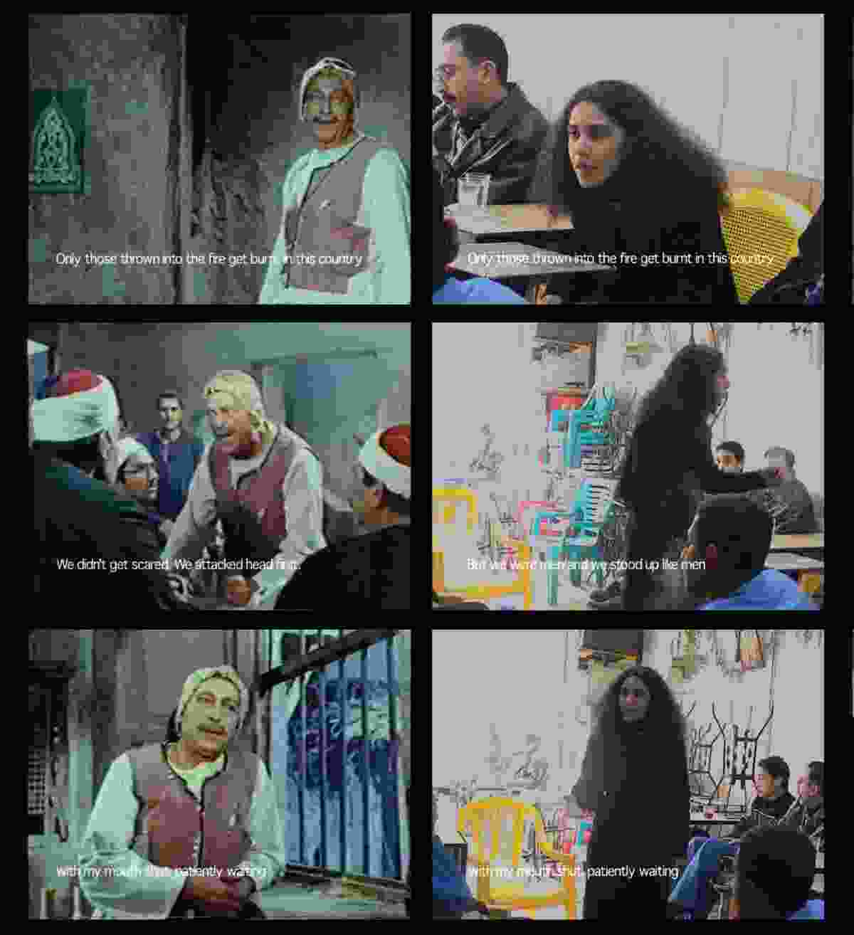 A rumination on the stagnant nature of politics, the exhibition presents two narratives that conflate space and time — raising questions as to notions of progress and the myth of modernity at large. A scene from Youssef Chahine’s canonical film El Ard (The Earth, from Abdel Rahman El Sharkawi’s novel of the same title), in which the protagonist decries the passivity of his fellow Egyptians during the British occupation, is echoed by a contemporary scene in which a young woman in a coffee shop delivers a damning oration, more or less re-emphasizing that very frustration. ‘Move people!’ The two scenes face off, in Shirin Neshat fashion. The moral of the story is that nothing changes. And talk is cheap.