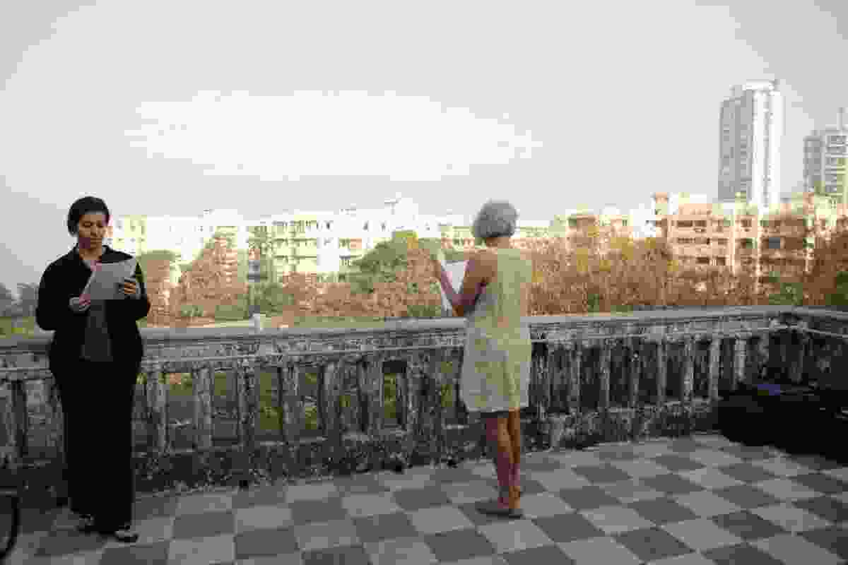 The vignettes that make up Vishal Jugdeo’s Goods Carrier (2012) take place in a large colonial-era mansion overlooking Bombay. Playing as much of a role as the five characters who inhabit the video, the setting and city frame the interactions and conflicts that unfold between the actors, who are all Indian, with the exception of one male figure — an actor named Billy Wright whose shock of red hair and white skin always feel out of place. Wright’s character floats in and out of each scene, for the most part, an observer with little narrative intent other than that of an enigmatic foreign body double. The house, in turn, acts like an evacuated stage, an architectural fragment caught between forlorn disrepair and the timeless classicism of the colonial style.