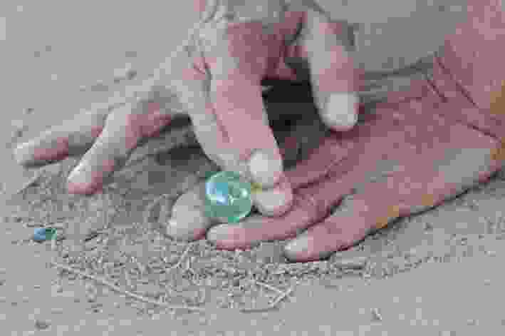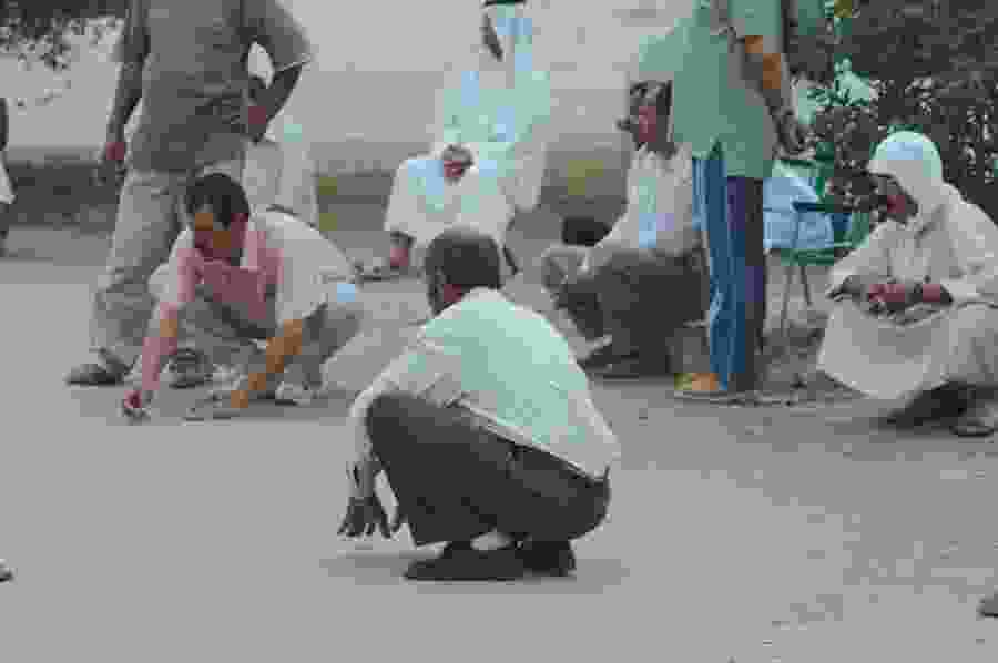 A circle of some twenty old men are sitting around playing marbles. They’re split in two teams of four players. They look focused and immersed in the game, very much indifferent to the world around them. Old fogies with balls. A scene that could be anywhere. Boccia in Italy, pétanque in France. This particular congregation of wizened gentlemen is somewhere in downtown Al Sharq, Kuwait, and the game they are playing is called “teeyla.” The men are speaking in Farsi; teeyla was apparently imported from Iran sometime in the 1950s.