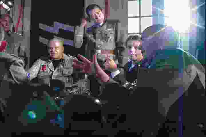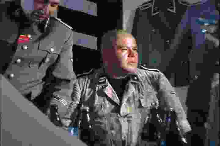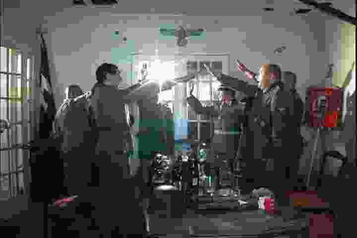 As the conversation evolves among cameras, lights, and boom operators — which the actors take as witnesses to the seriousness of their propositions — the heated discussion gets more and more personal until one of the characters says, irritated, that he isn’t acting anymore. As if he ever was. Here again, the escalating tension emanates from the factual documentation of what first started as a staged situation, turning National Socialism into a somewhat historical construction that these dressed-up characters lightly call a metaphore.
