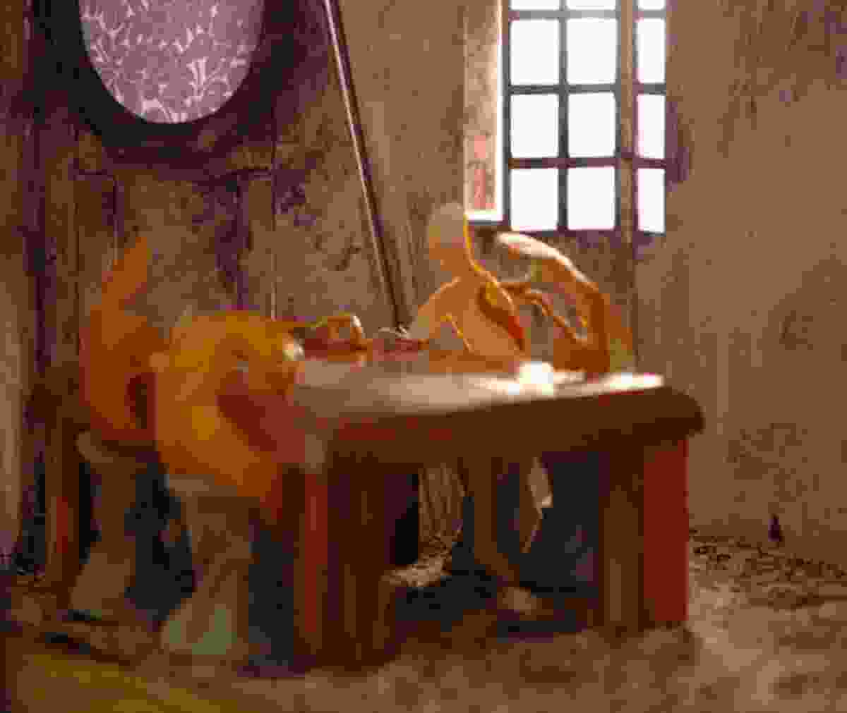 In a movie that seeks to portray the Persian king as effeminate — a move beloved of Western Orientalists since Herodotus's Polymnia — reading these baubles as blobs of semen seems oddly reasonable and becomes even more so when we consider the role proskynesis, or ritual prostration, plays in this tale. Snyder's 300 is all about not kneeling before a king — only slaves and traitors do so, here — and the implication is that by wearing these gilded sperm proxies, Xerxes is demonstrating that he bends the knee to a higher power. If Snyder is using this device to contrast masculine, rationalist, straight (ha!) Sparta with feminine, mystic, polymorphously perverse Persia, it's hard to know whether to find it grossly offensive or merely to laugh. With their Muscle Mary glutes and wipe-clean underwear, Leonidas and company look just about as gay as it gets, and one is tempted to suspect the director of a secret, shaming crush on them, like the homophobic frat boy who nurtures private fantasies of rubbing Deep Heat into the star quarterback's tectonic shoulder blades. Curiously, the director's other creation, the fictionalized Xerxes, is far better adjusted and seems to find his own ambiguous relationship with sex and power rather fun. An out bi man with the world at his feet, he wears his kinks on his sleeve, or rather his face.