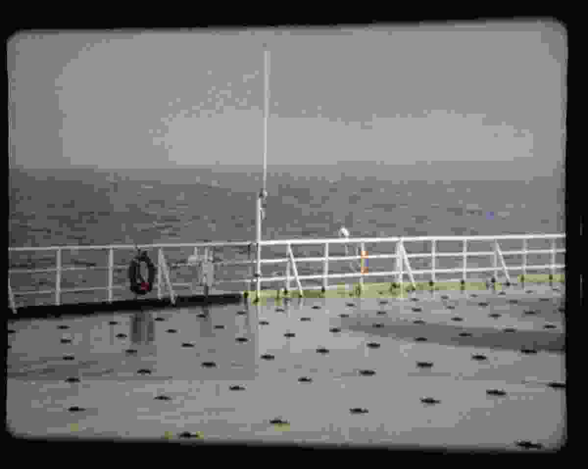 Rosalind Nashashibi's Bachelor Machines Part I centers on the unspectacular activities of the Italian crew of the cargo ship Gran Bretagna as it travels from Italy to the Baltic Sea. Over the course of thirty minutes, the men go about their business — attending to ship activities, eating, smoking and playing cards, dancing (furtively) in the dining room. But this is not the stuff of “reality television” — the onboard community of men is not subjected to the sort of documentary-making that seeks to expose its subjects’ private lives to an audience hoping for a prurient glimpse of a world they'll never know. Nor is life aboard ship aestheticized. There is a sense of respectful distance, a refusal of intimacy that belies the filmmaker's intimate access — a refusal underlined by the dialogue being in Italian, none of it subtitled and none of it important, really; or rather, not to the point.