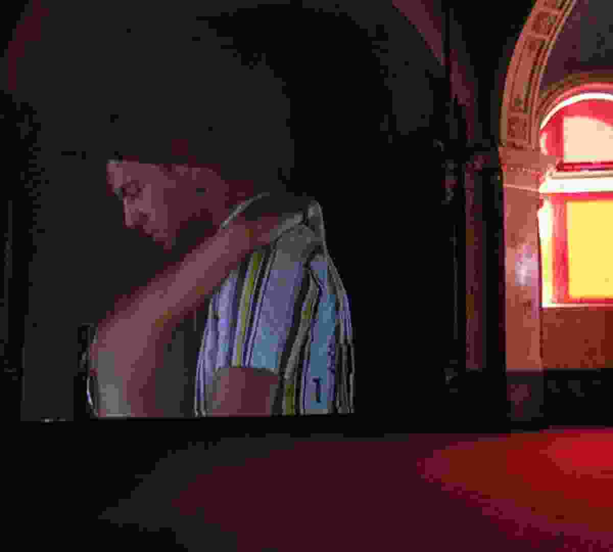 Nashashibi's background as an Irish-Palestinian artist educated in England and Scotland (she graduated from the Glasgow School of Art in 2000) is often invoked as an explanation for her interest in the workings of particular subcultures and communities. But her interest, at least in ethnographic terms, can be seen more easily as having something in common with structuralist anthropology. Her film Eyeballing (2005), for example, is a playful series of static shots of objects and landscapes, some close-up, some in wide angle, in which it's almost impossible not to see the apparition of faces. Plainly, for evolutionary reasons, the human brain is hard-wired to recognize the combination of two dots or circles with a line beneath them as a face. These images are intercut with footage of New York City police — men and women — shot as they enter and exit what looks like a side door to one of Manhattan's many police stations. The juxtaposition between the deeply structural recognition of the faces and the deeply cultural, costumed roles played by the cops emphasizes the place of representation and ritual in the world around us. The faces emerge from the city and are both its inhabitants and its totems — or, in the artist's words, its “gods or monsters.”