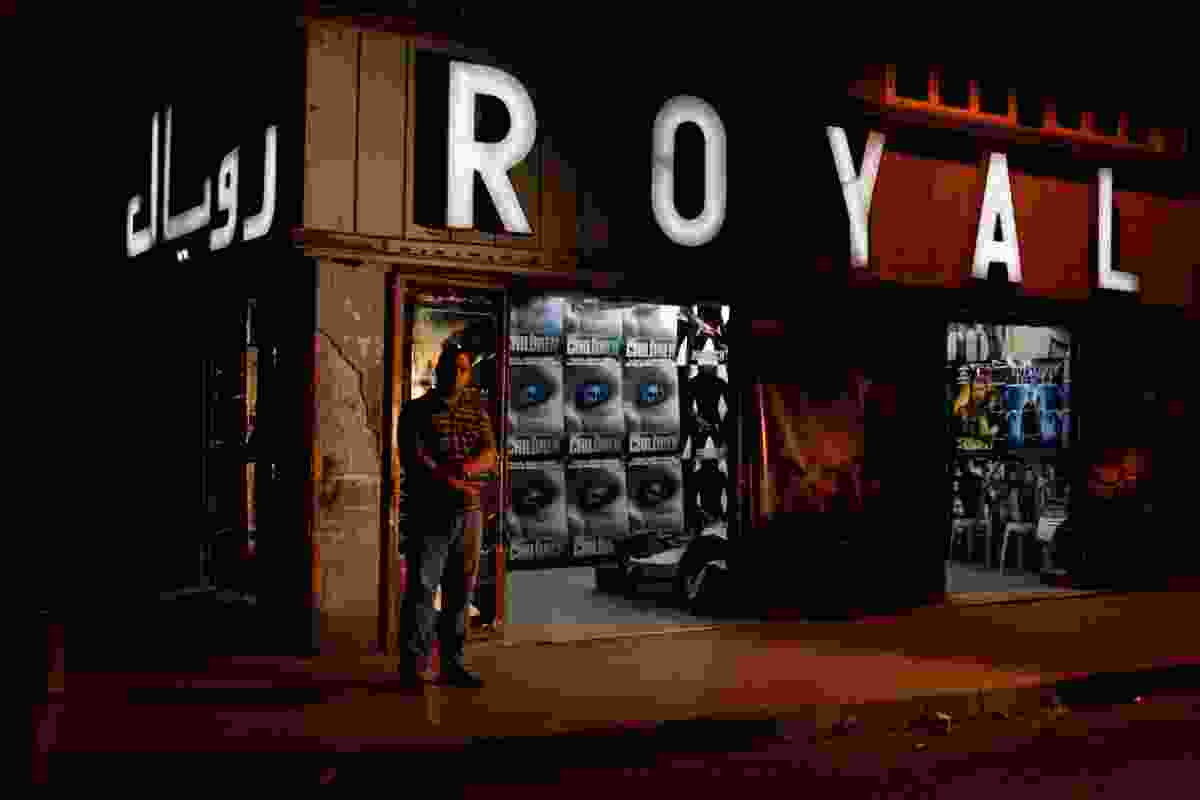 Still, despite her restraint, personalities emerge from her blackened backdrops: a breakdancer spins his legs while a DJ scratches records atop the broken-down stove of a derelict, graffiti-tagged kitchen; the members of Scrambled Eggs pose in a bookshelf-lined bedroom, sporting Converse sneakers and sunglasses and smugly sucking on cigarettes; the rapper I-Voice sits on the far side of a flowery couch pressed against an egg-crate wall at Burj al-Barajneh refugee camp, looking pained; the dance-rock group Lumi appears bathed in purple light, the singer, wearing a reflective dress, vamping for the crowd.
