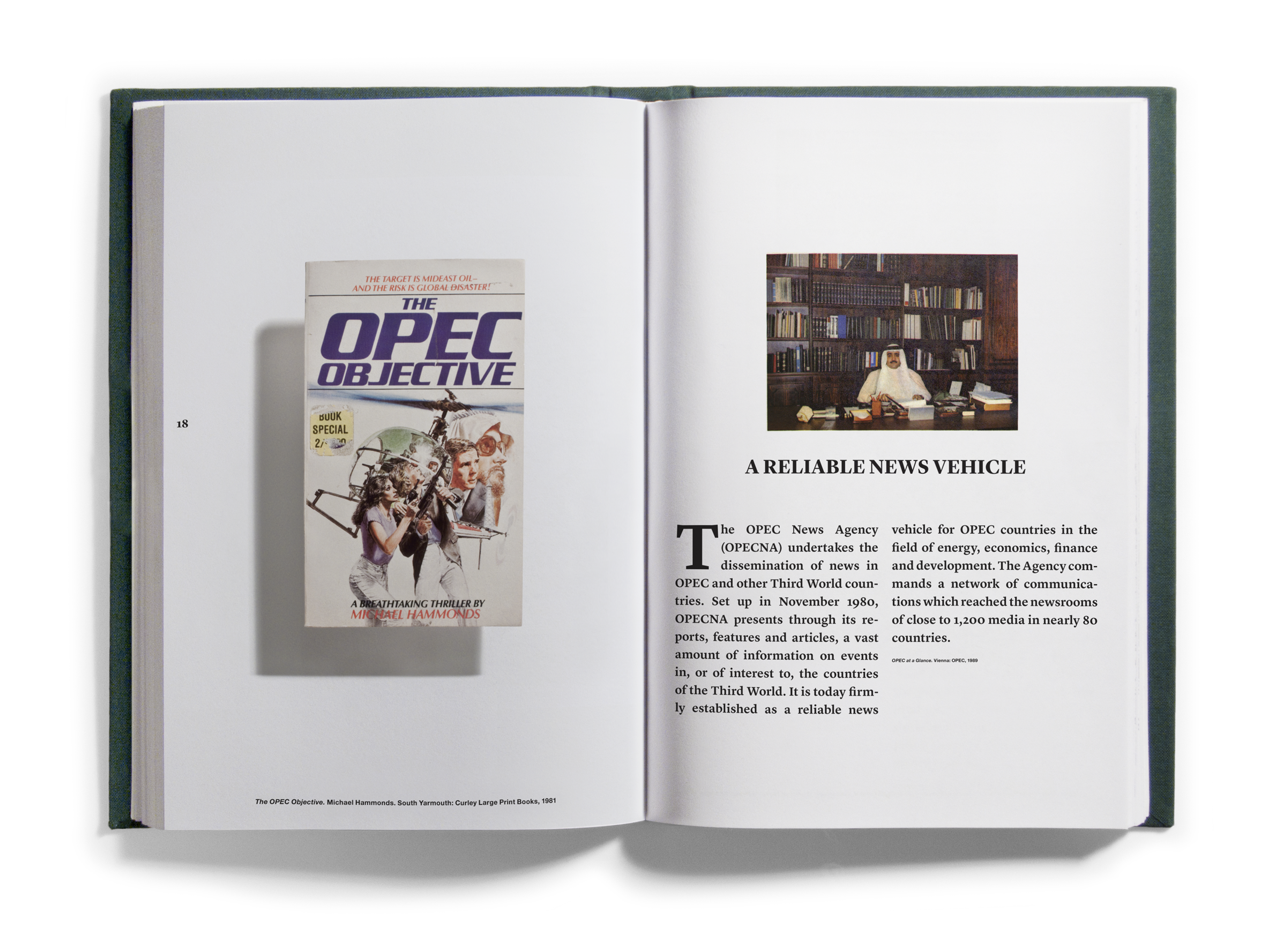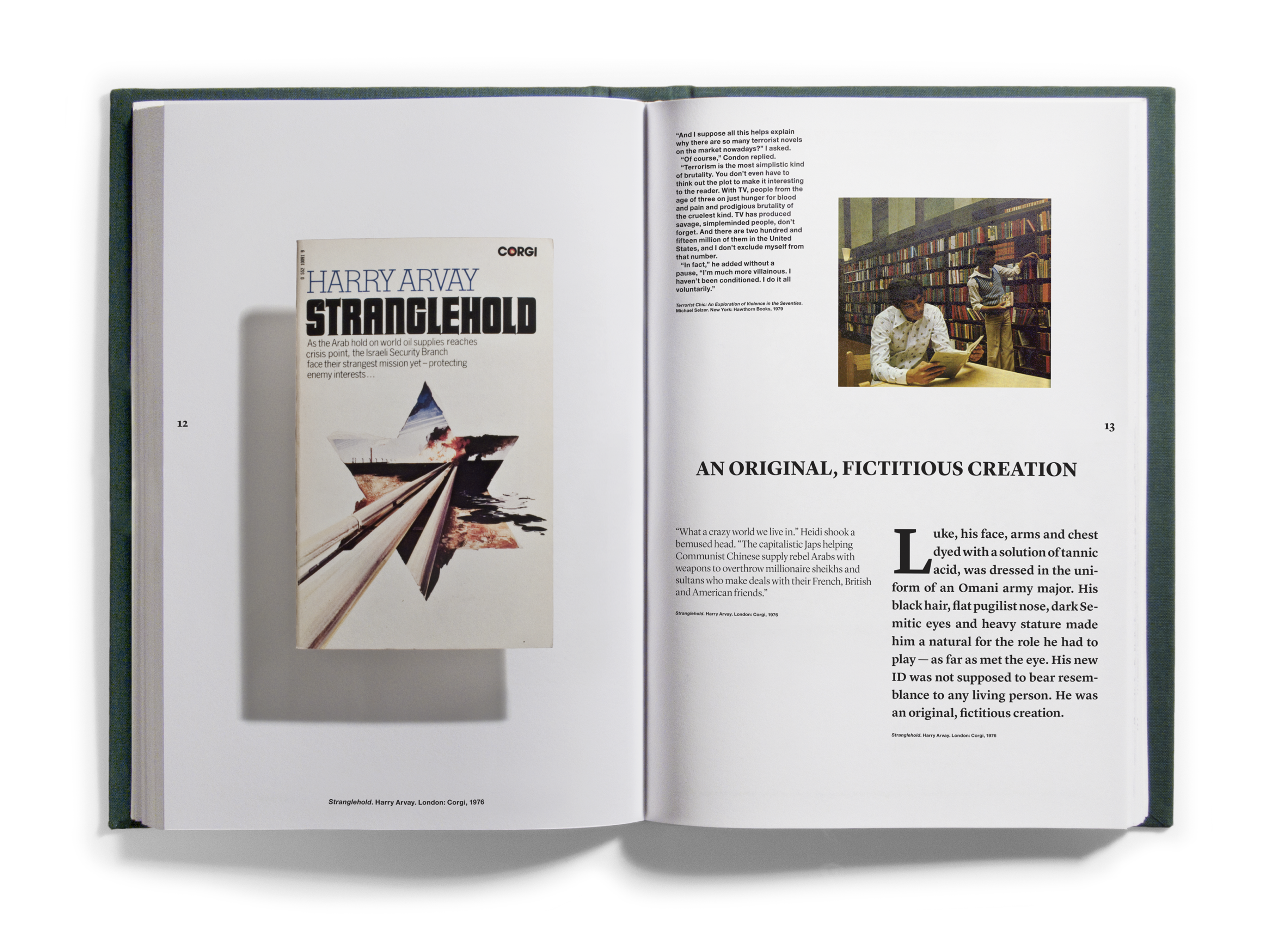 This particular collection of books was the outcome of a series of escalating searches on the World Wide Web. Deploying a search term like “oil,” “Arab,” or “Middle East” would return an unmanageable array of books — but adding an additional search term would narrow the field in telling ways. Books about oil before 1973 that cost less than five dollars are few and almost entirely in hardcover, usually technical guides written for a specialized audience. After 1973, the same search yields a completely different array: in hardcover, hundreds of books about the coming oil crisis, rampant Arab wealth and influence, global bankruptcy, impending world war, and biblical Armageddon. At the same time, in paperback, the terrorist novel is born, and its brood is legion — cover after cover depicting vintage special agents, Israeli commandos, vigilante lone wolves, soldiers of fortune, and even a black samurai, karate-kicking djellaba’d sheikhs beside burning oil rigs, often after sampling the delicacies of the inevitable harem. A similar set of searches substituting “Iran” for “Arab” produced its own assortment of types and stereotypes. We wanted to see what would happen if we put together a library without regard to aptness or excellence; to choose books not for their subjects, but their contexts; not for their authors, but their publishers; not for their qualities, but in their quantities.