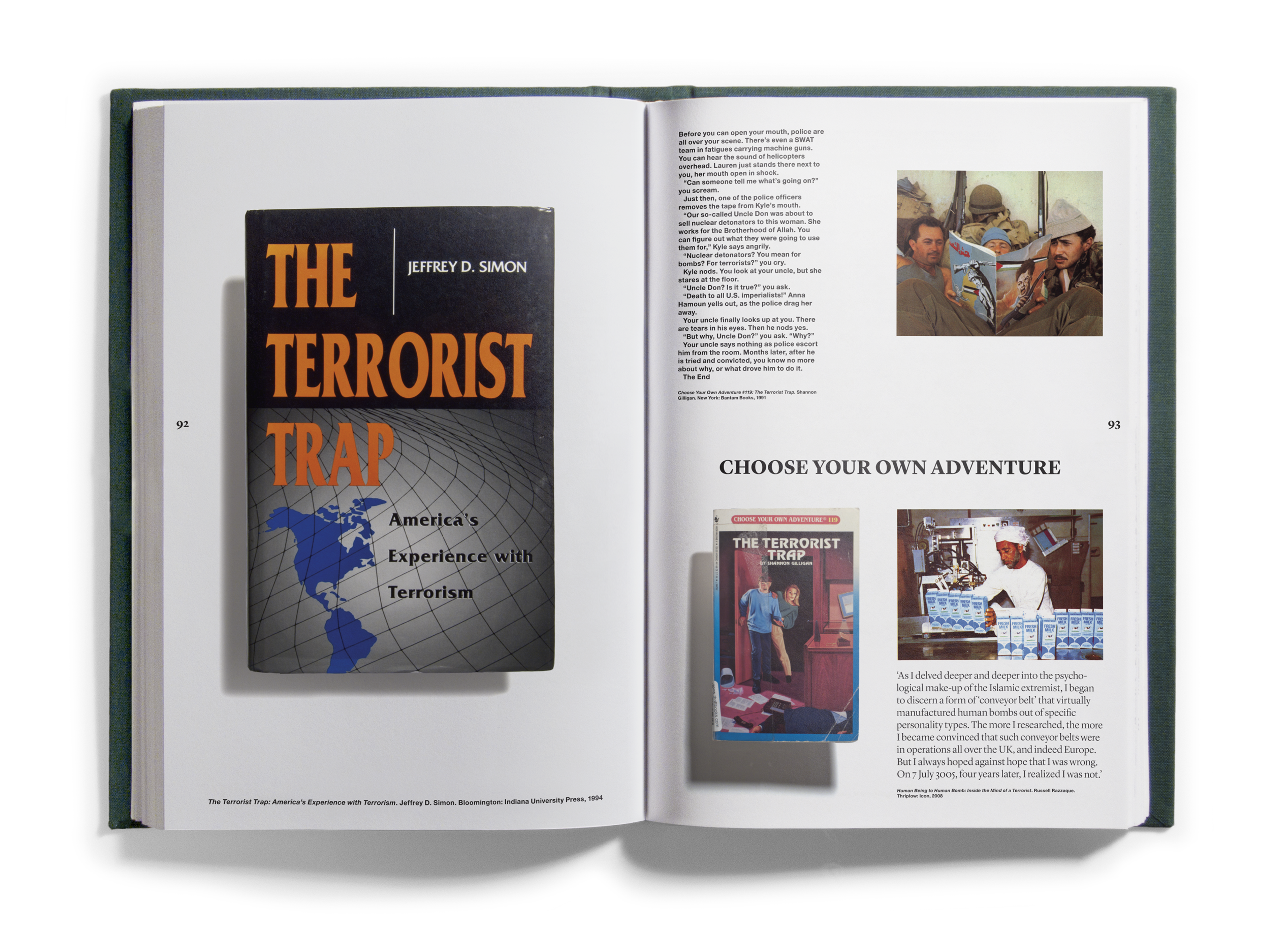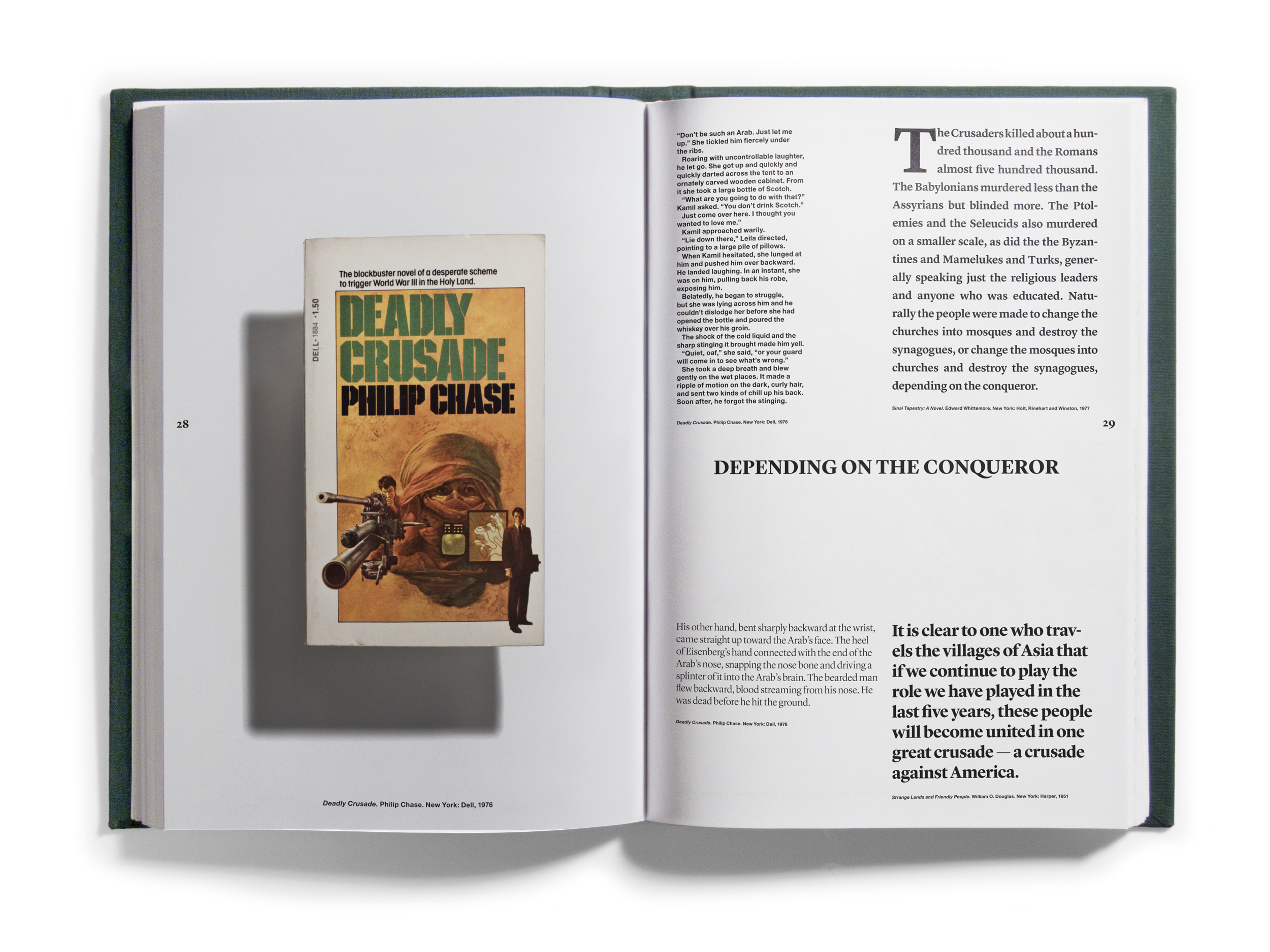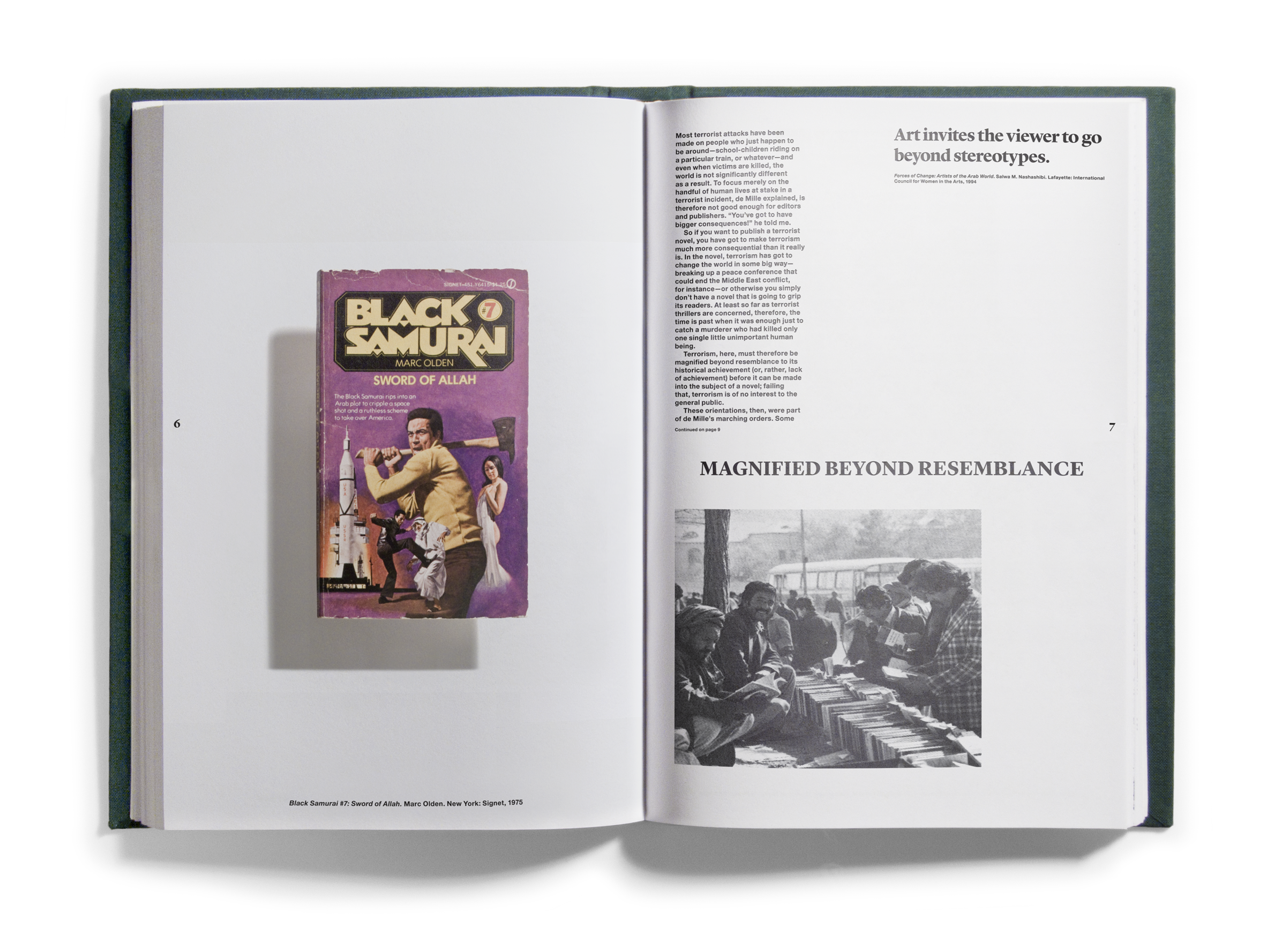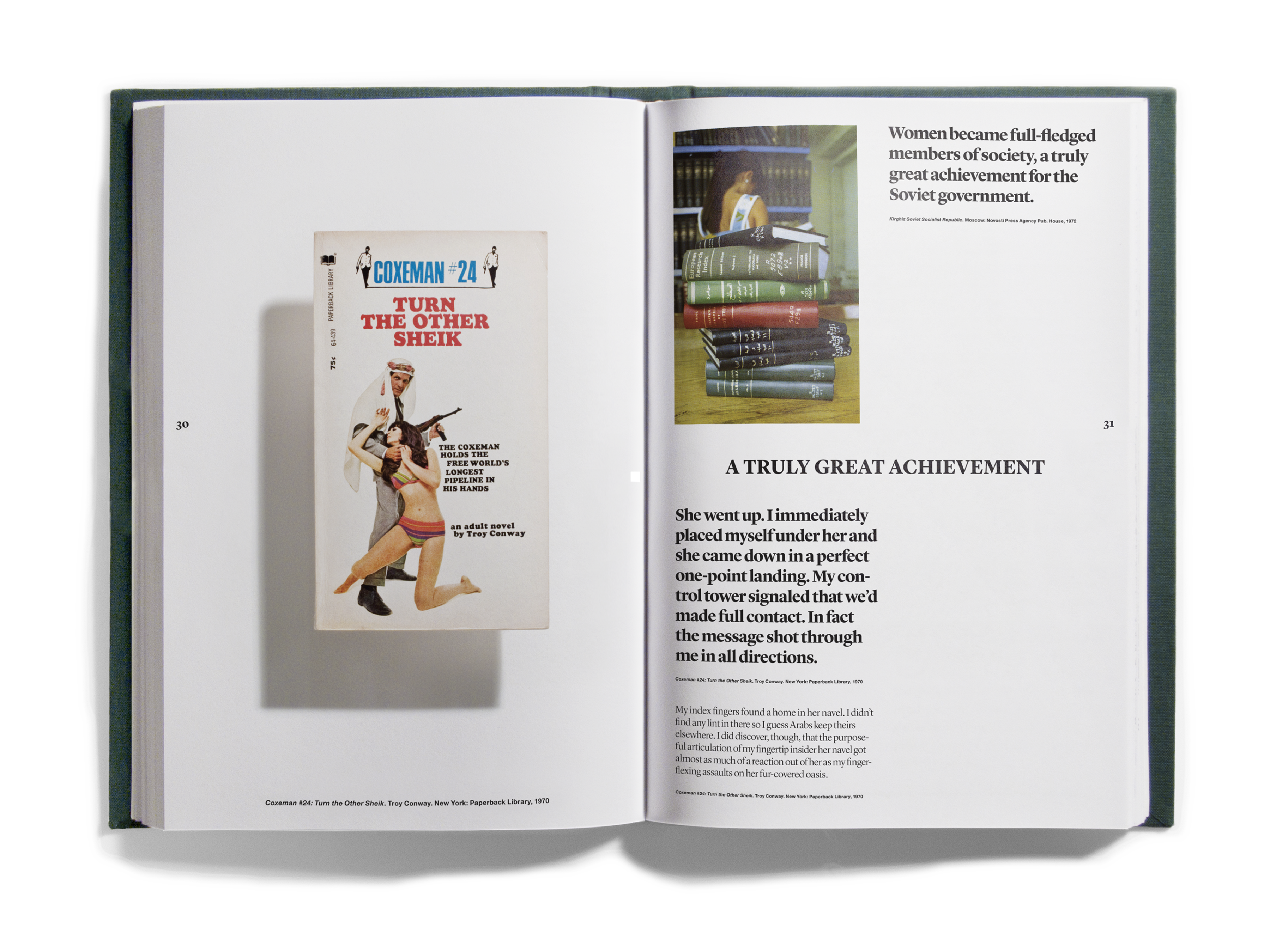 And quantities they did! Just shy of one thousand books came to occupy the Bidoun office, and as they arrived we read them — all of them, book by book. As we read, we marked passages and images for transcription and scanning, which were then indexed according to topics — descriptions of artworks, photographs, flags; jokes and sexual innuendos; captions, acknowledgments, asides. Things that, considered out of context, revealed a surplus or a deficit of meaning. Those texts and images were then organized into four books that were suspended by chains from the ceiling of the New Museum at strategic points in the exhibition space. Three of the books corresponded to general categories: Home Theater/pulp, Natural Order/corporate publishing, and Margin of Error/“other.” A fourth book, Further Reading, purported to be a glossary for the other three. We called the books catalogs, though as such they were incomplete, inaccurate, and perplexing. What the catalogs did do was provide an example of one way of reading the library — to look over our shoulders as we read the library, in its entirety, and to see some of the associations and parallels within. This issue of Bidoun is in a sense a third reading of the library and a rereading of those catalogs — they are reproduced here, in sequential order, nested within the pages of the magazine.