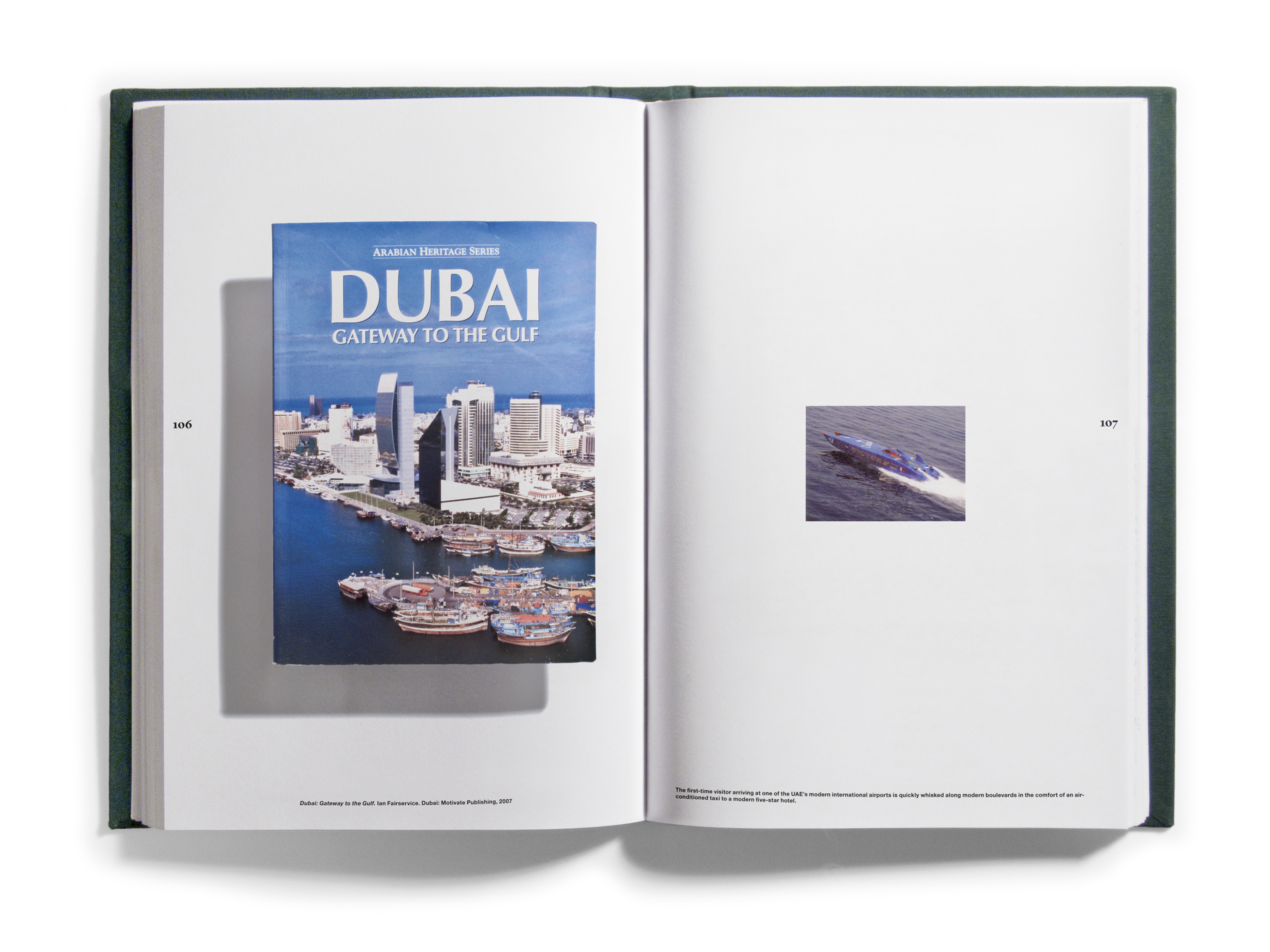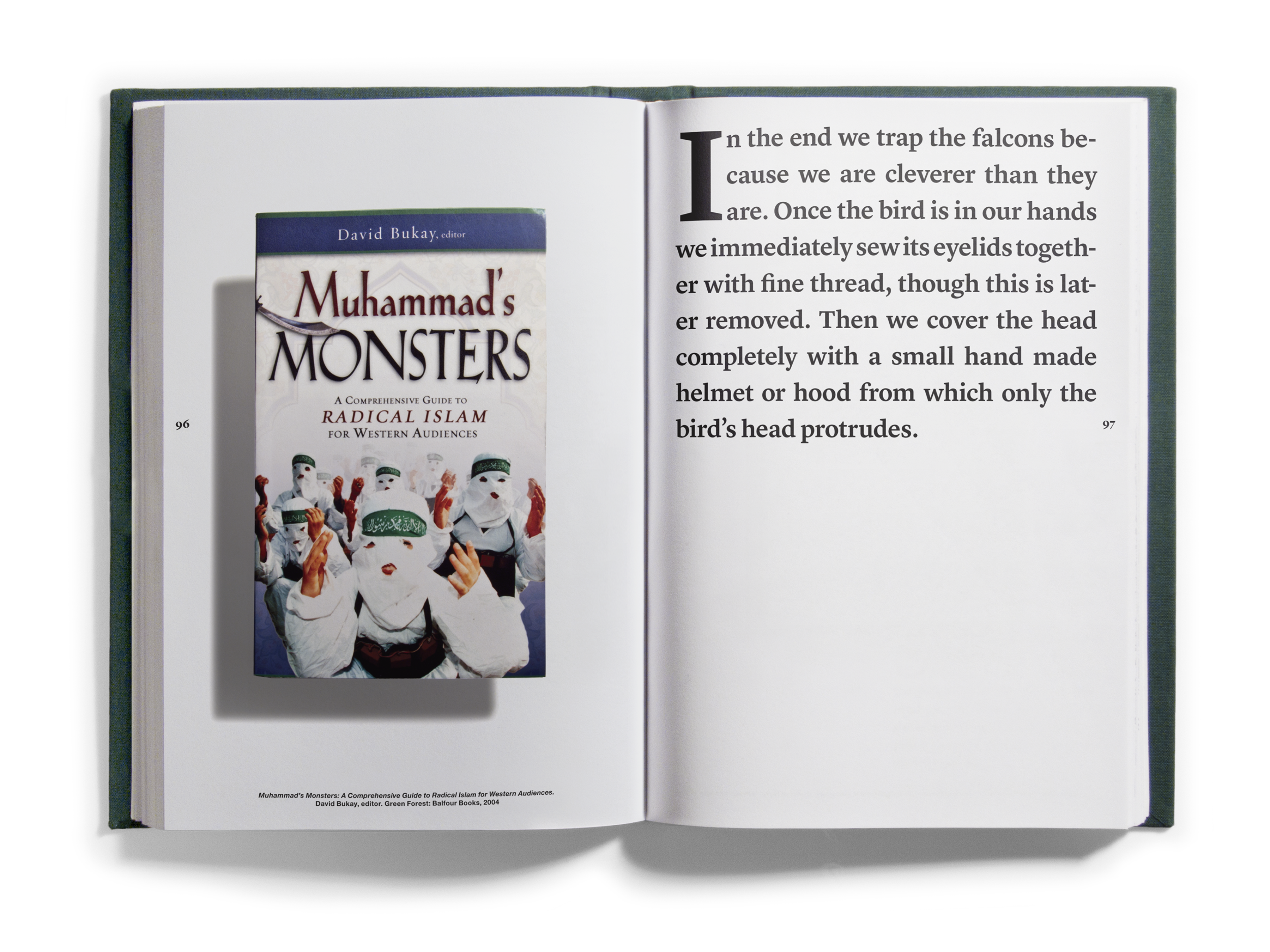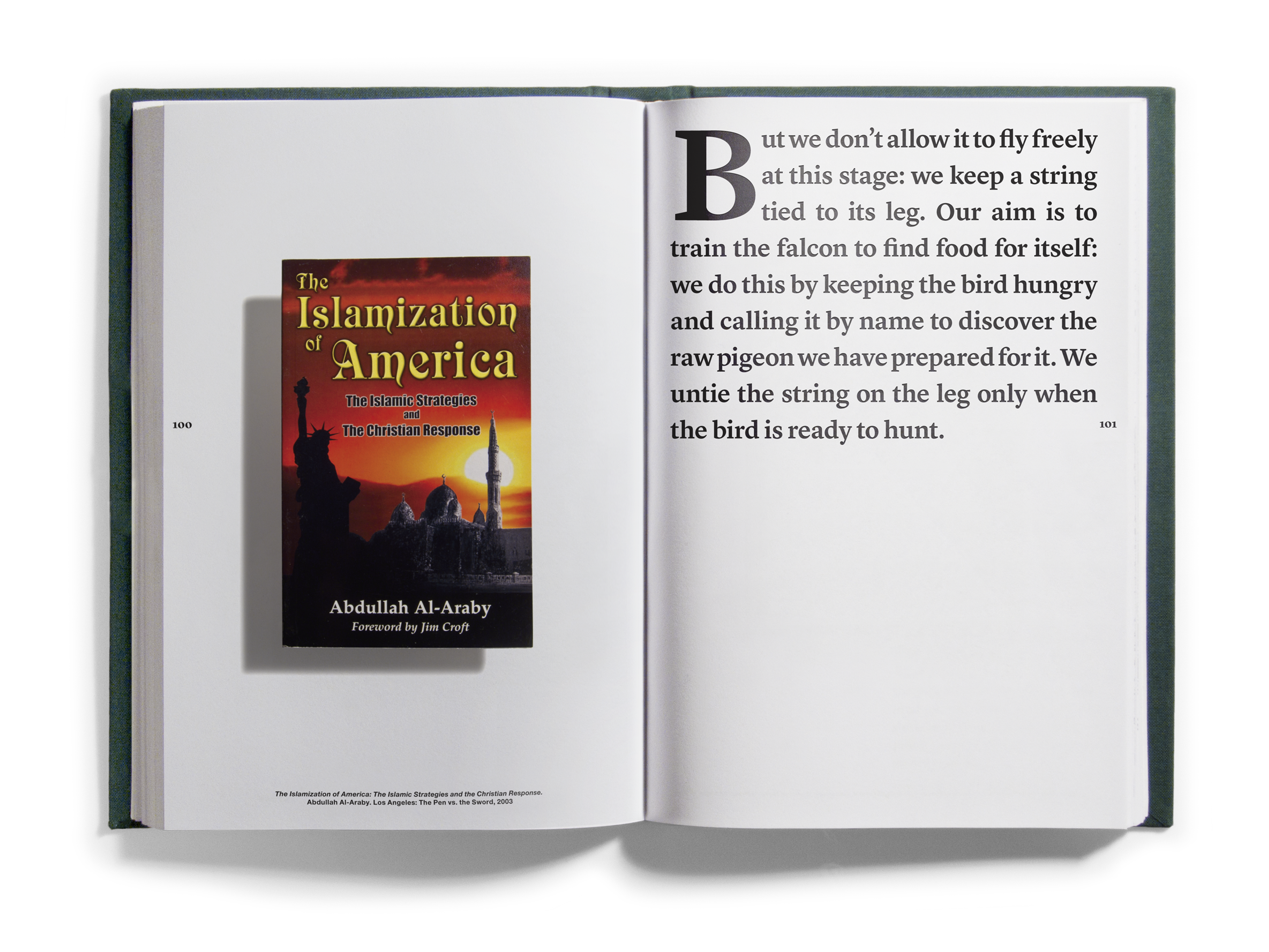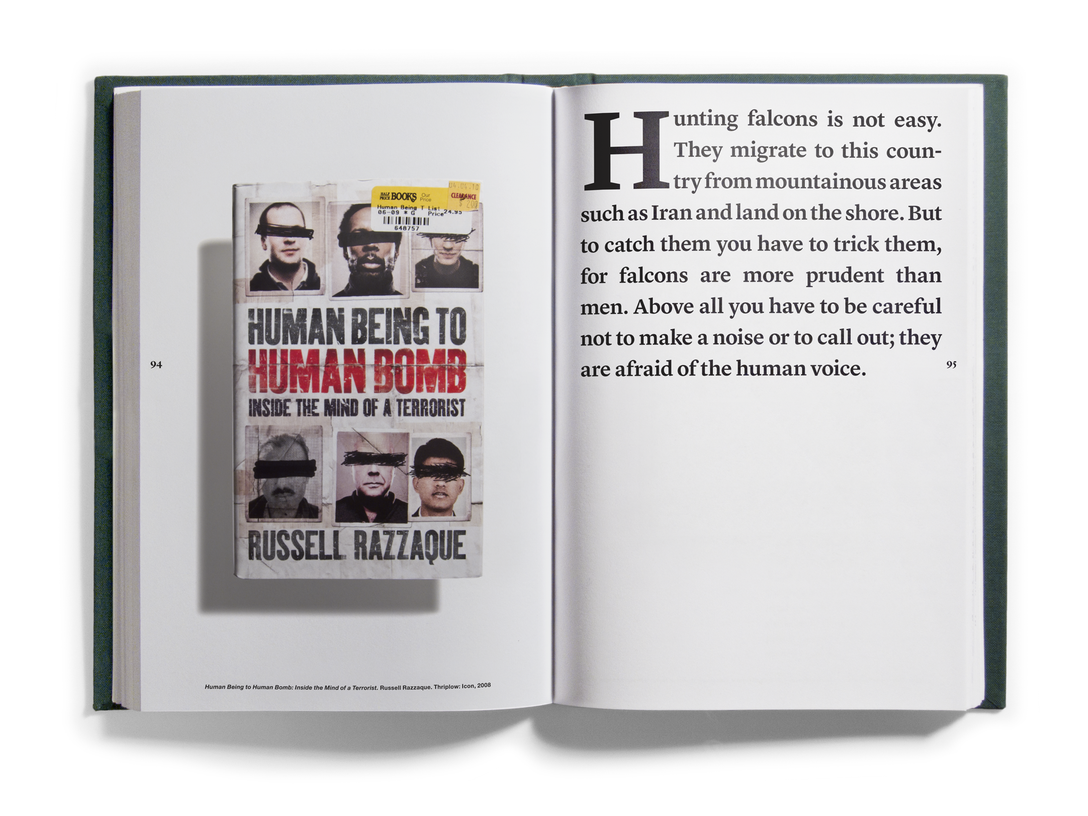 And quantities they did! Just shy of one thousand books came to occupy the Bidoun office, and as they arrived we read them — all of them, book by book. As we read, we marked passages and images for transcription and scanning, which were then indexed according to topics — descriptions of artworks, photographs, flags; jokes and sexual innuendos; captions, acknowledgments, asides. Things that, considered out of context, revealed a surplus or a deficit of meaning. Those texts and images were then organized into four books that were suspended by chains from the ceiling of the New Museum at strategic points in the exhibition space. Three of the books corresponded to general categories: Home Theater/pulp, Natural Order/corporate publishing, and Margin of Error/“other.” A fourth book, Further Reading, purported to be a glossary for the other three. We called the books catalogs, though as such they were incomplete, inaccurate, and perplexing. What the catalogs did do was provide an example of one way of reading the library — to look over our shoulders as we read the library, in its entirety, and to see some of the associations and parallels within. This issue of Bidoun is in a sense a third reading of the library and a rereading of those catalogs — they are reproduced here, in sequential order, nested within the pages of the magazine.