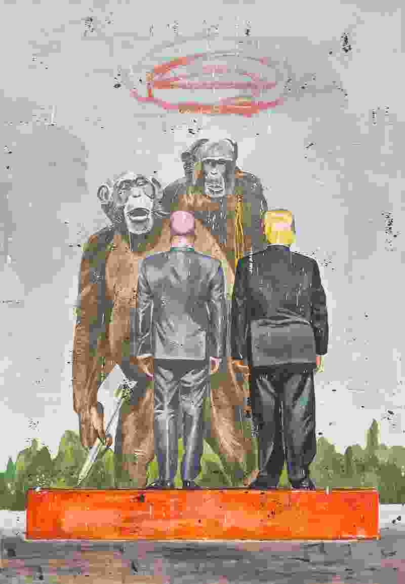 Nicky Nodjoumi’s paintings explore the emotional dynamics of contemporary politics. The brushwork is quick, loose, and expressive, although the compositions are carefully worked out well in advance. His protagonists are often men in suits — the uniform of authority — painted against spare backgrounds.