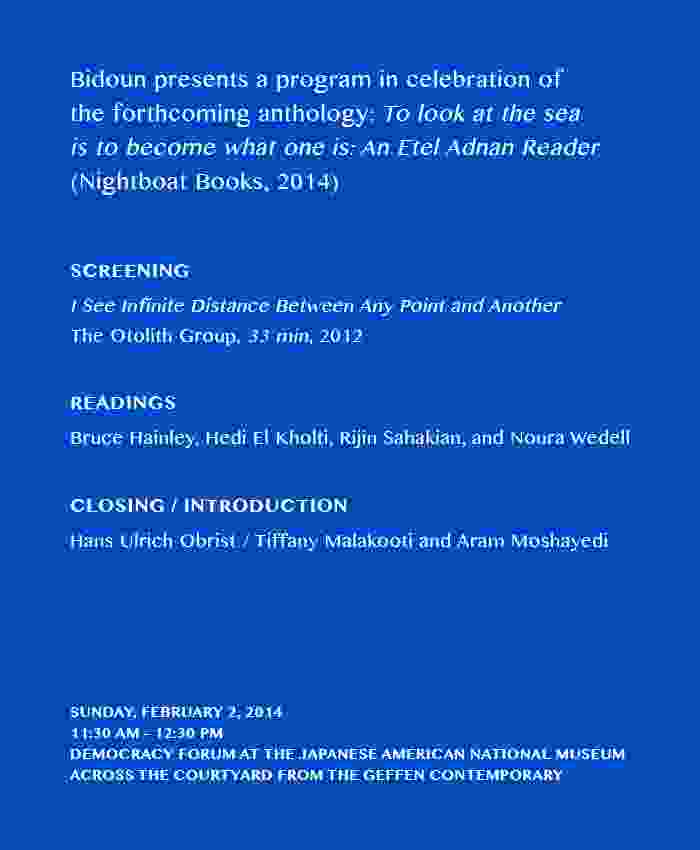 Bidoun presents Etel Adnan: To look at the sea is to become what one isSunday, February 2, 2014, 11:30 am – 12:30 pmDemocracy Forum at the Japanese American National MuseumAcross the courtyard from the Geffen Contemporary